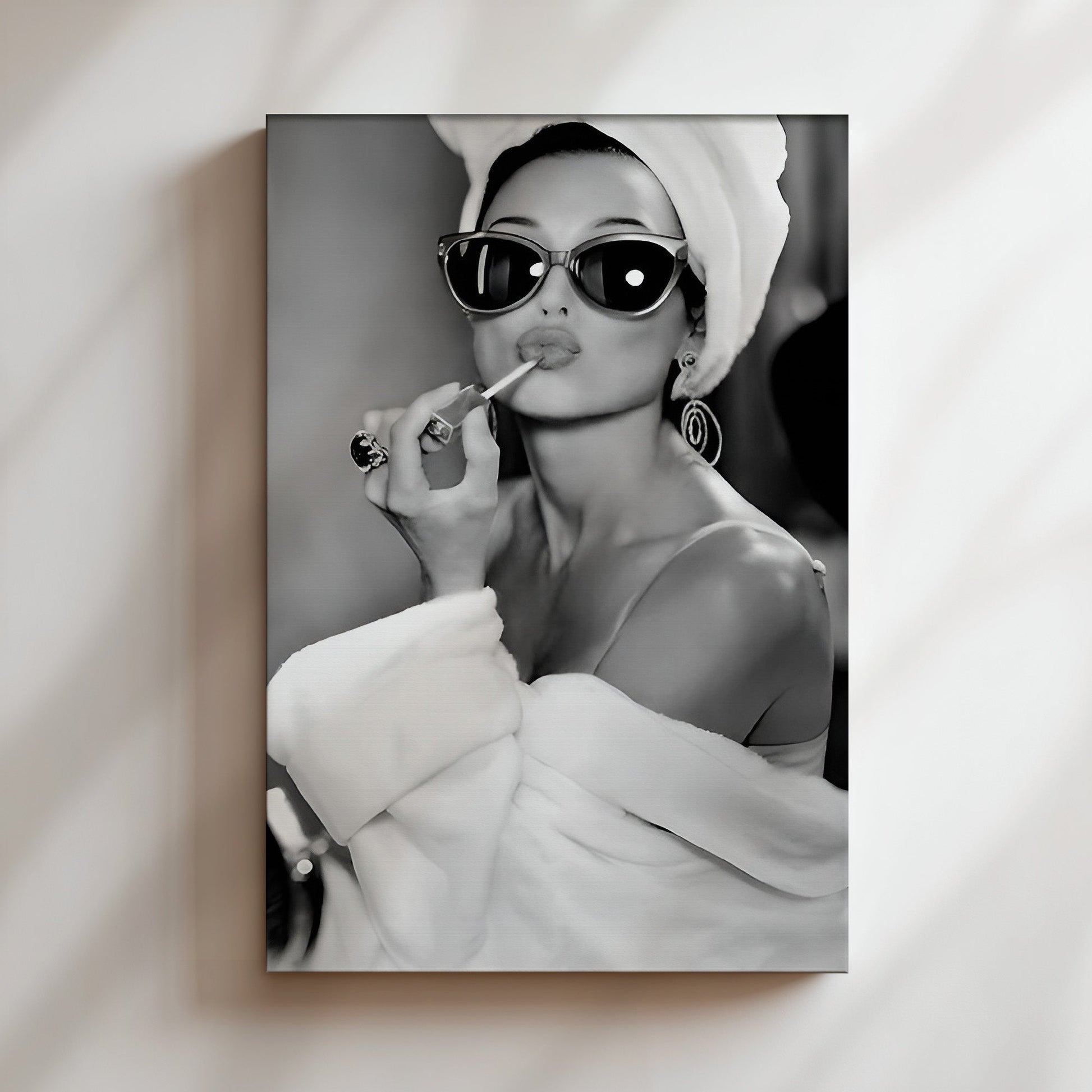 Audrey Hepburn Applying Lipstick Canvas, Classic Hollywood Beauty Wall Art, Feminine Glamour Poster Print for Bedroom or Vanity Decor