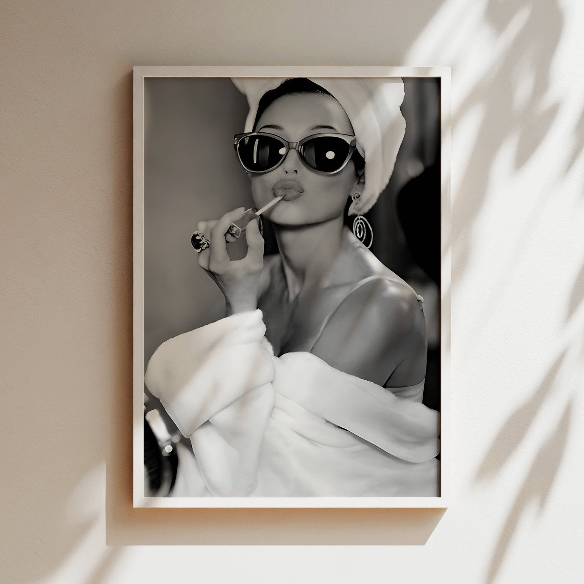 Audrey Hepburn Applying Lipstick Canvas, Classic Hollywood Beauty Wall Art, Feminine Glamour Poster Print for Bedroom or Vanity Decor