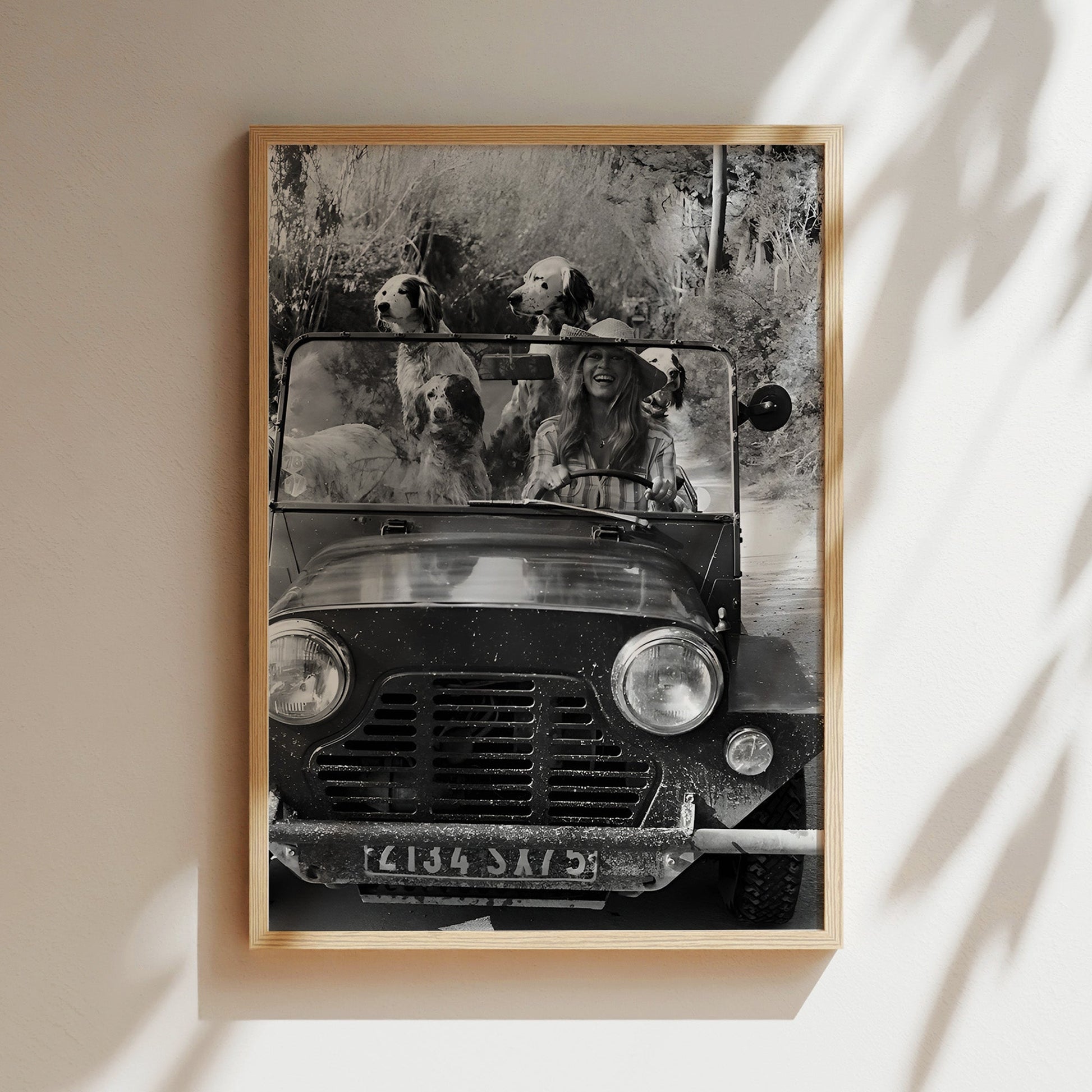 Brigette Bardot in Car with Dogs Canvas Print, Vintage French Icon Wall Art, Retro Celebrity Poster with Dogs for Chic Home or Studio Decor