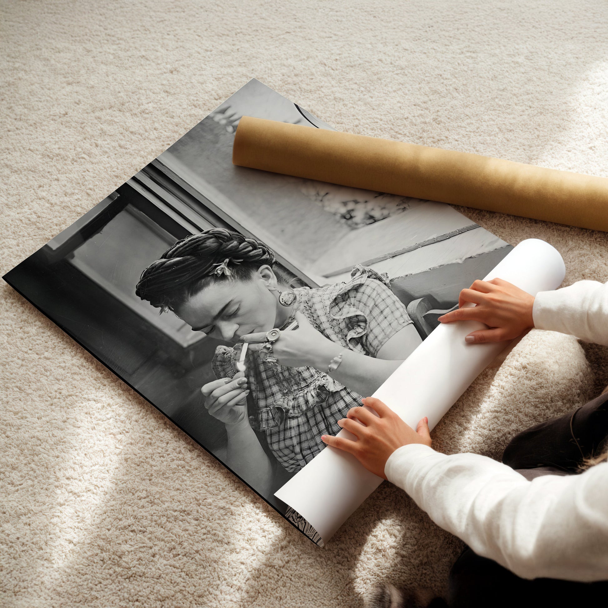 Frida Kahlo Lights a Cigarette Canvas Print, Bold Iconic Artist Wall Art, Vintage Bohemian Poster for Artistic Home or Studio Decor