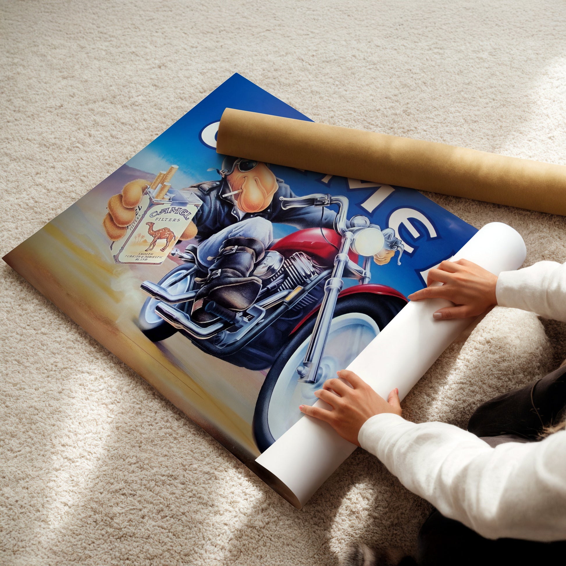 Joe Camel Motorcycle Poster – Retro Tobacco Advertising Art, Cool Biker Wall Decor, Vintage Camel Cigarettes Print, Man Cave Garage Art