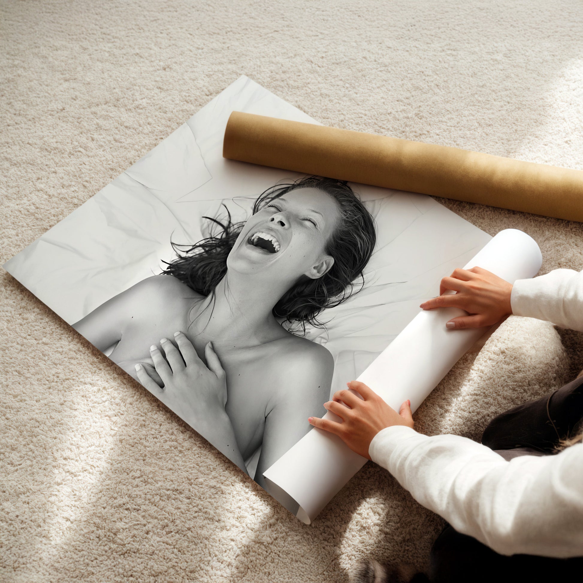 Kate Moss Laughing in Bed Black and White Wall Art - Natural Beauty Nude Glamour Poster - Fun Iconic 90s Supermodel Home Decor for Fans