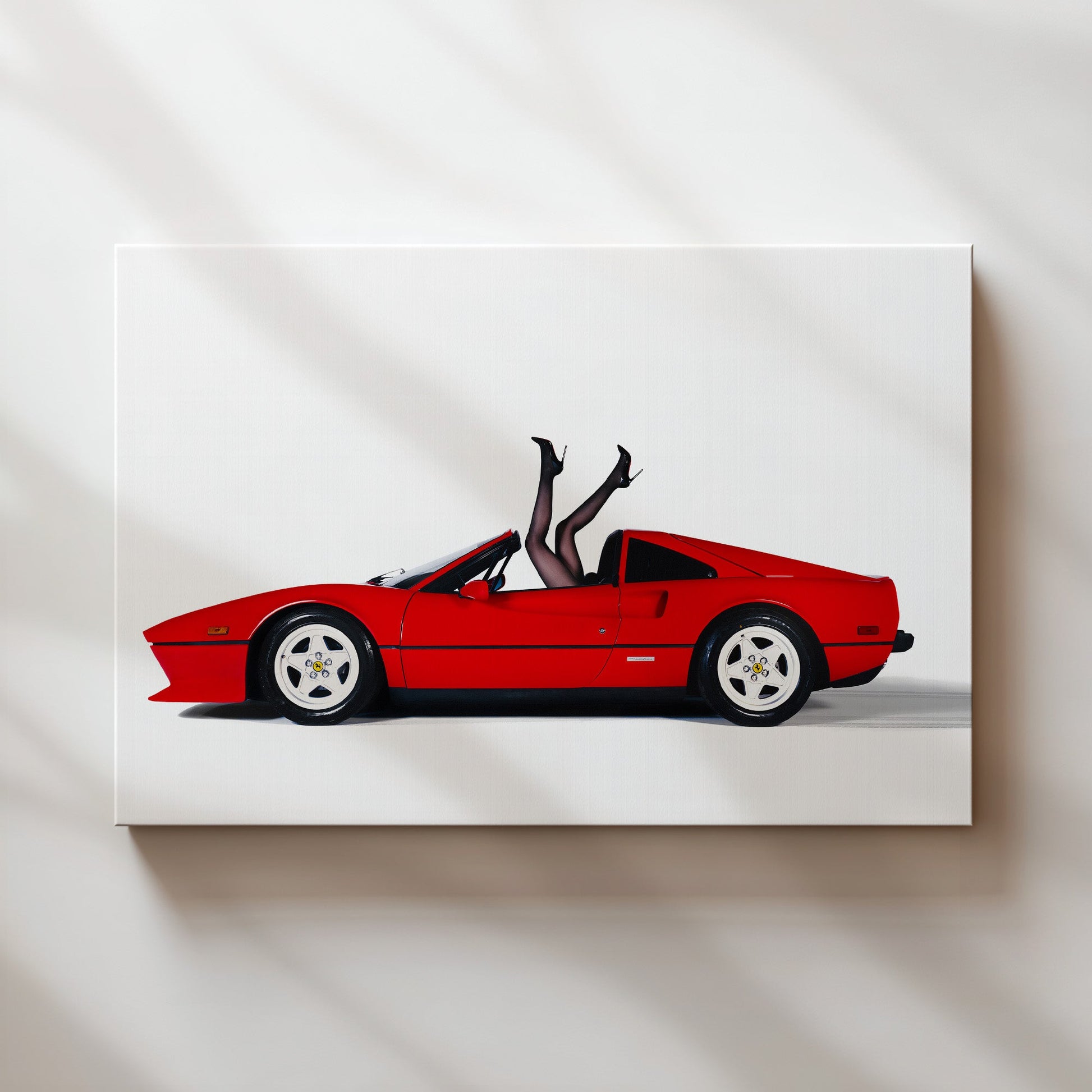 Woman's Legs in Red Ferrari Wall Art - Playful Vintage Glamour Car Poster - Bold Fun Decor for Auto Lovers, Pop Art Fans, Retro Spaces