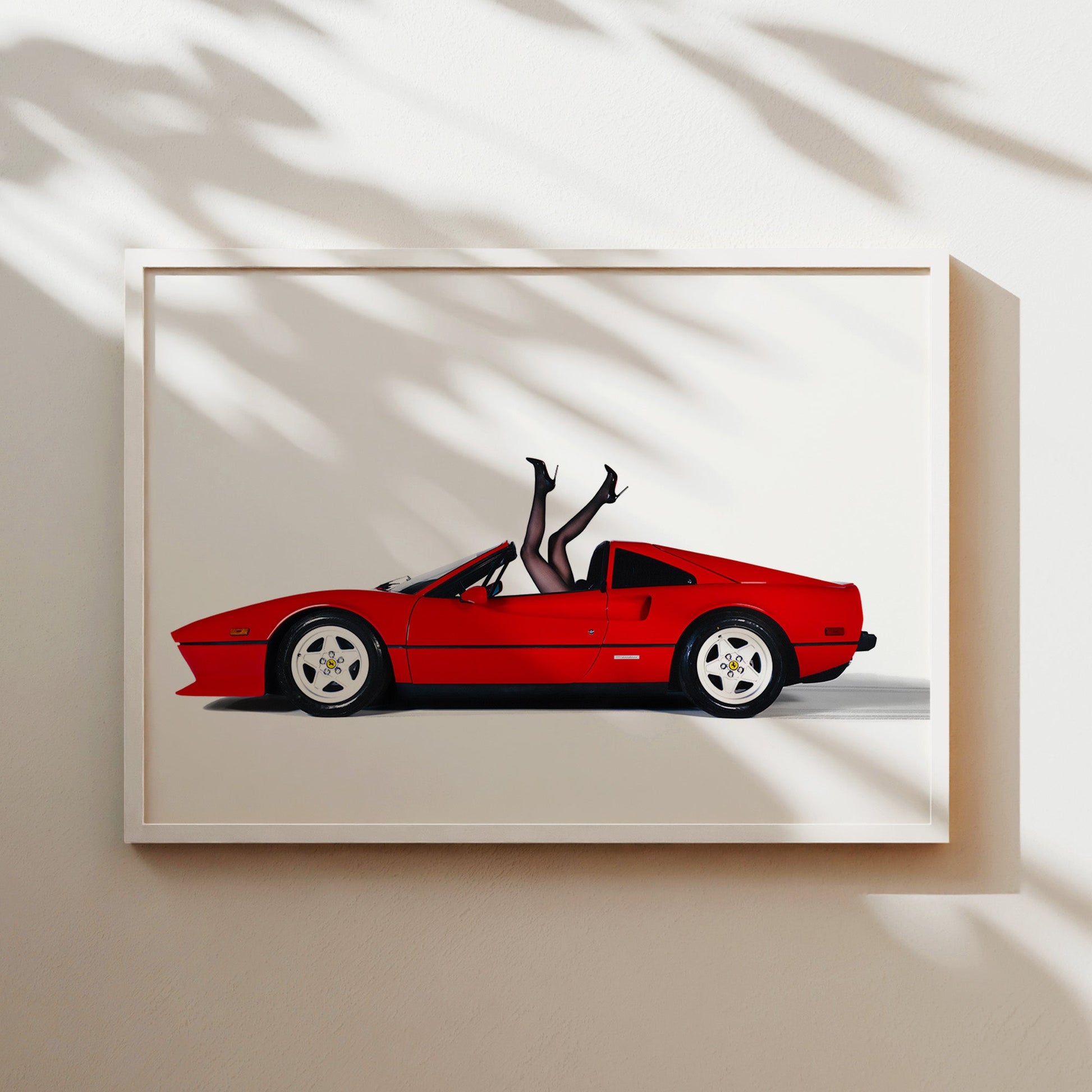 Woman's Legs in Red Ferrari Wall Art - Playful Vintage Glamour Car Poster - Bold Fun Decor for Auto Lovers, Pop Art Fans, Retro Spaces
