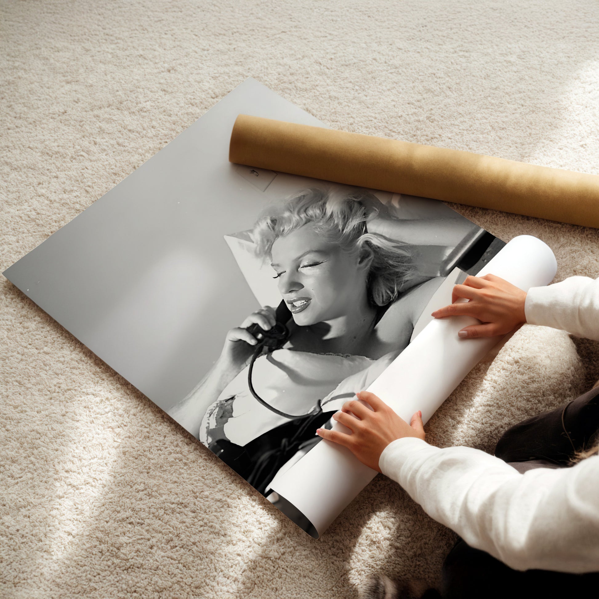 Marilyn Monroe on Telephone in Bed Canvas Print, Vintage Hollywood Icon Wall Art Poster, Classic Celebrity Glam for Timeless Home Decor