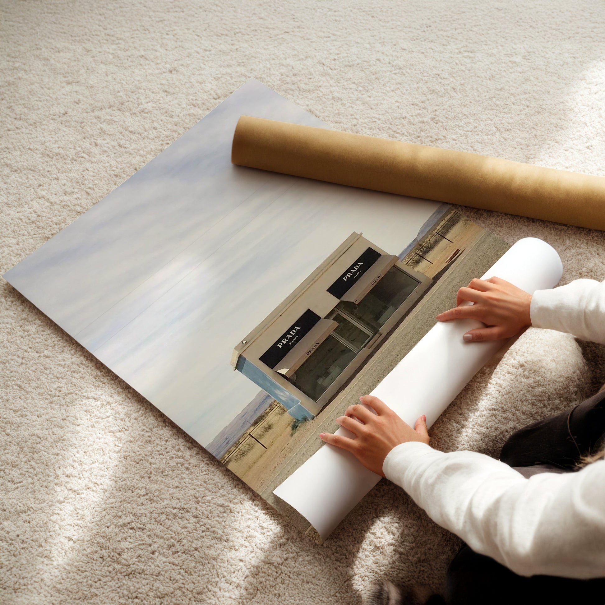 Prada Marfa Wall Art - Iconic Fashion Landmark Poster, Minimalist Black & White Print for Chic Bedrooms or Modern Living Spaces