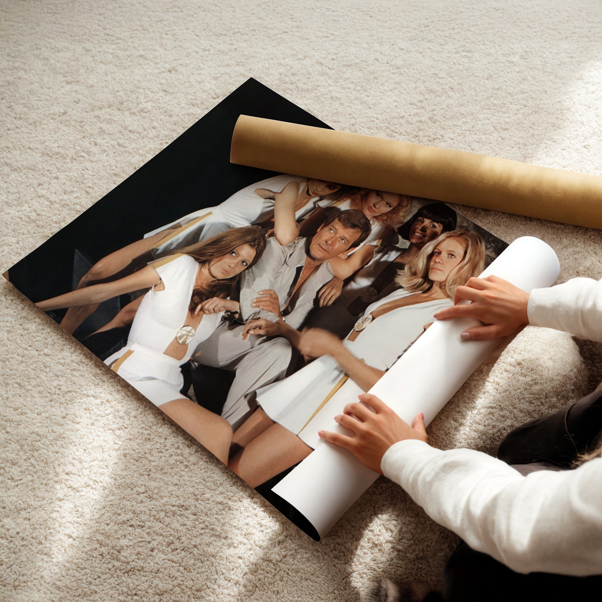 Roger Moore James Bond with Bond Girls Wall Art - Vintage 70s Spy Movie Poster - Glamorous Retro Cinema Decor for Film Buffs and Collectors