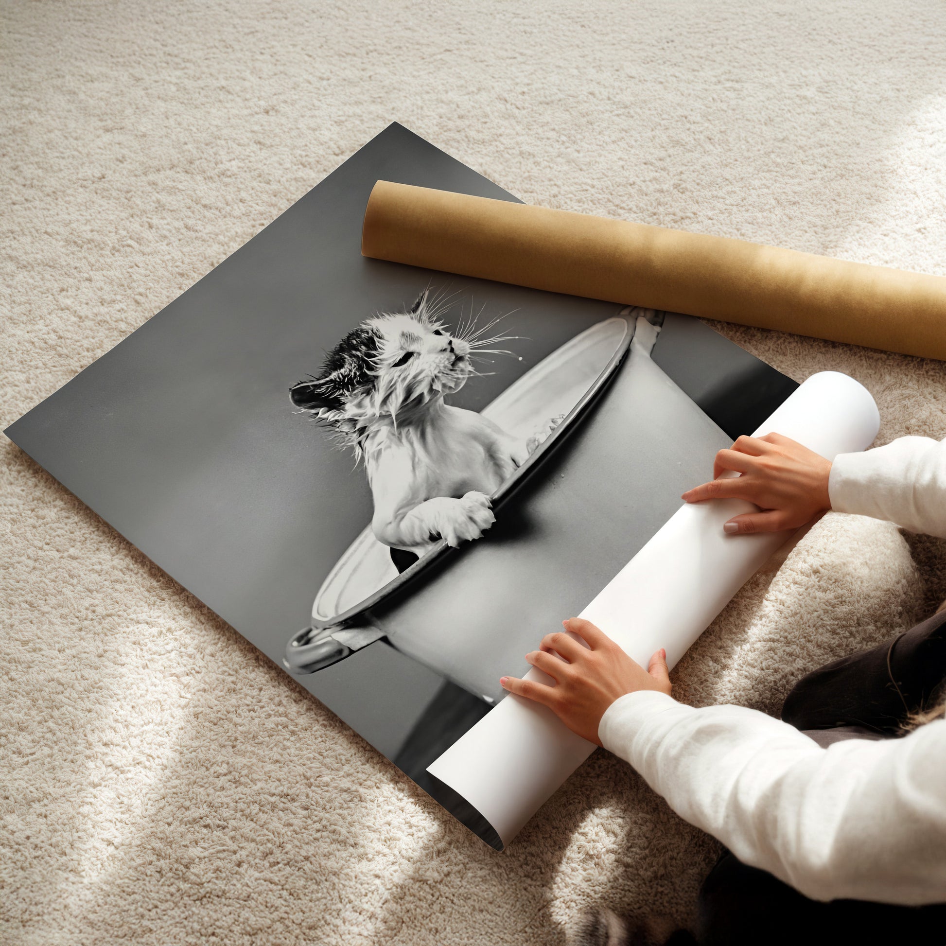 Washing Kitten in a Bucket Wall Art - Funny Black & White Animal Photo, Cute Vintage Cat Poster for Bathrooms, Laundries or Quirky decor